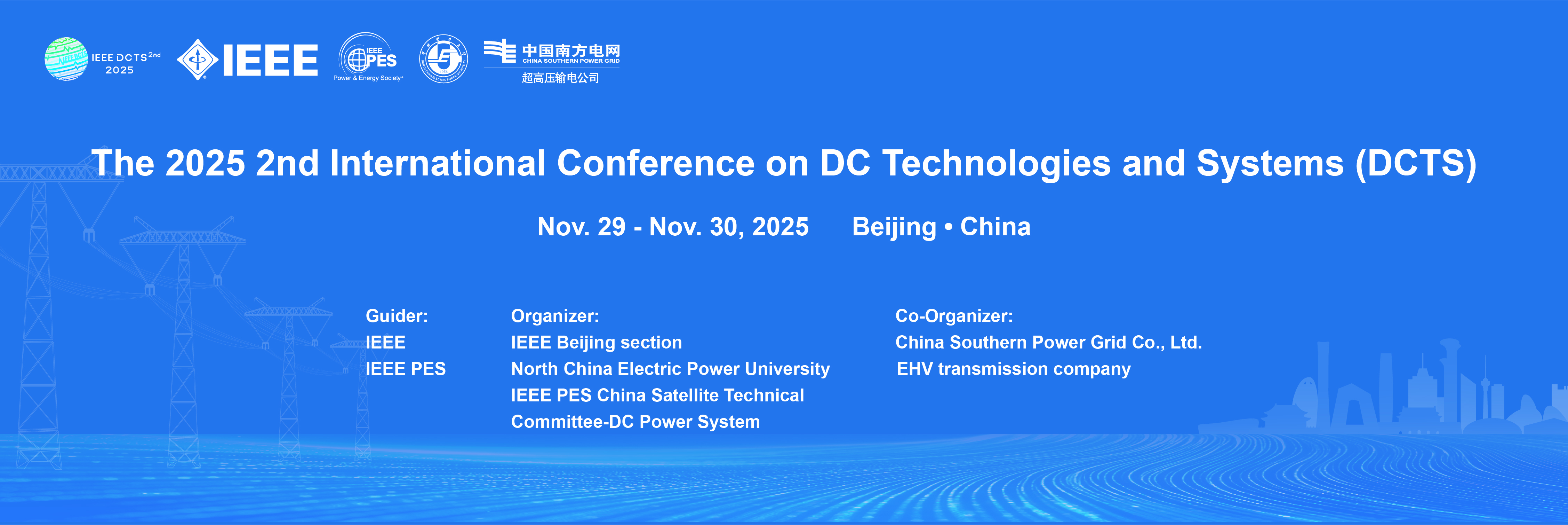 The 2025 2nd International Conference on DC Technologies and Systems (DCTS) will be held at the Wyndham Hotel in Beijing Longcheng from November 29th, 2025 to November 30th, 2025. IEEE DCTS is the first international conference on DC technologies and systems by IEEE.